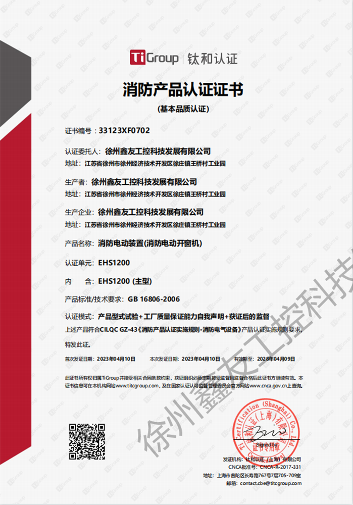 徐州鑫友工控科技發(fā)展有限公司成立于2008年,占地31600平方米,全資子公司:江蘇良紫工程科技有限公司,旗下 有“鑫友”及“MASTER.W主人窗控”兩個(gè)品牌系列,公司全面貫徹執(zhí)行IS09001:2015質(zhì)量管理體系標(biāo)準(zhǔn),產(chǎn)品順利通過(guò)歐盟CE認(rèn)證和中國(guó)***消防電子產(chǎn)品認(rèn)證,通過(guò)可燃性粉塵環(huán)境下、爆炸性環(huán)境下防爆合格產(chǎn)品檢驗(yàn)。排煙天窗整窗通過(guò)***消防產(chǎn)品質(zhì)量監(jiān)督檢驗(yàn)中心檢測(cè)。先后獲得多項(xiàng)******及榮譽(yù)證書。集研發(fā)、加工、生產(chǎn)、制造、銷售、安裝及售后于一體,是一家高起點(diǎn)、研發(fā)能力強(qiáng)的專業(yè)智能化***技術(shù)企業(yè)。